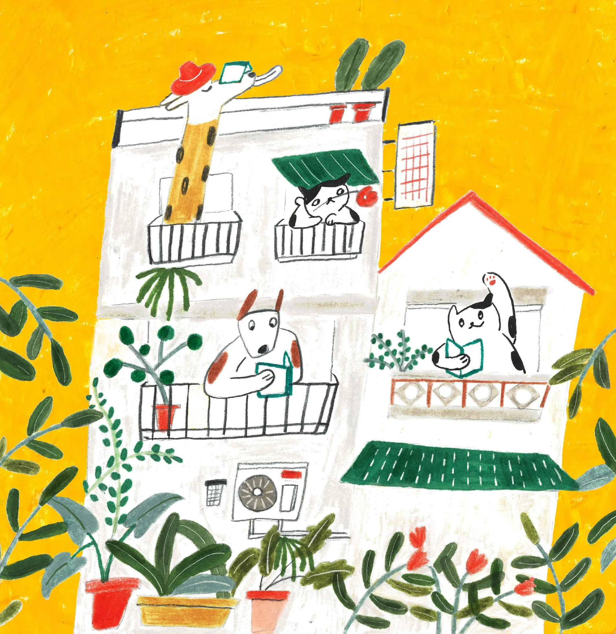 The animals each enjoy a peaceful moment on their balconies—some are reading, some are thinking, and some are saying hello. From across the street, they quietly share a sunny afternoon together. A perfect day to read, relax, and feel connected.