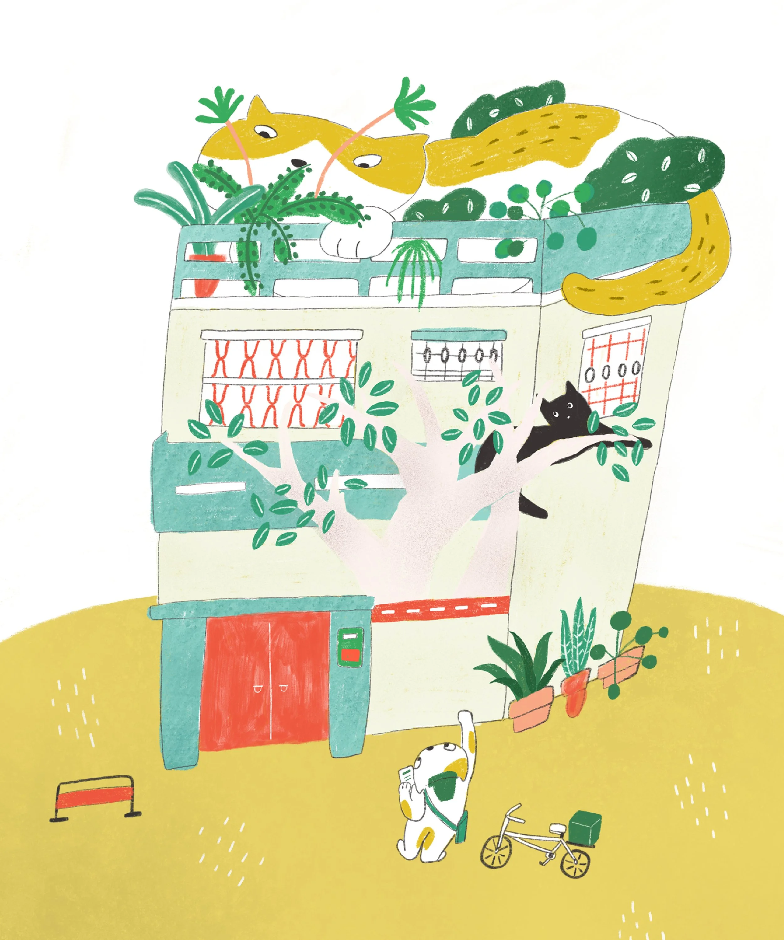 Inspired by the my childhood home in Tainan, this illustration captures the playful energy of cats hiding around an old Taiwanese building.